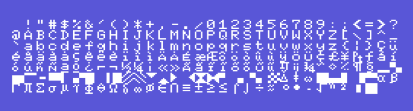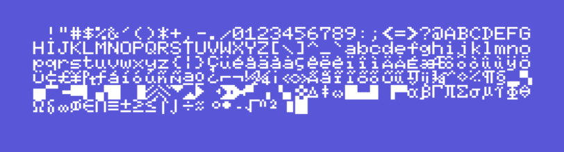 Oddly both screens 0 and 1 don’t start with the maximum width available for each of the modes, so we have to change the values from LINL40 and LINL32 system variables to fill the screen lines completely. Below are the default character sets available for a standard AMERICA/NTSC MSX system: