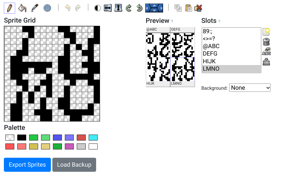 <figcaption>It was easier than it actually looks!</figcaption></figure></div>With the character pattern done and looking impressively not bad at all, all I had to do was to click in “Export Sprites”, select “ASM Hexa” at the “Export as” field and copy the whole thing to the clipboard. I saved the data in a local file just to be sure, and also generated a backup from my work so I could change it further in the future if needed. Maybe I could also change the lowercase letters if I find the courage for that.
