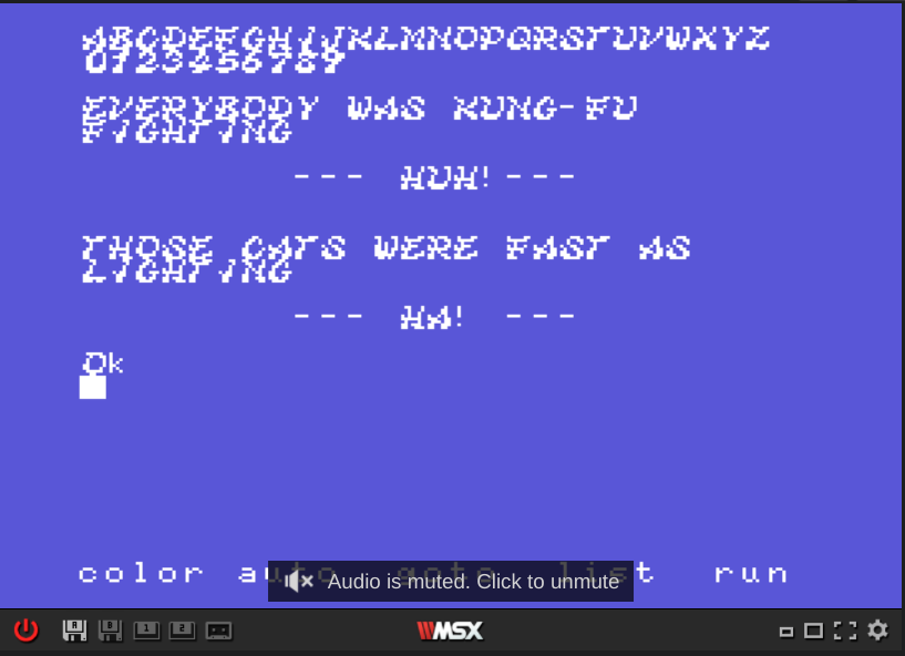 The code to load the pattern data back into the MSX VRAM isn’t complicated at all. I added a routine to print all numbers and uppercase letters so it could show the results after running the program, and also a message just for fun!