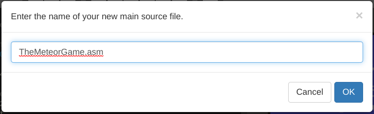 Proceeding to the 8BitWorkshop IDE, I will create a new project with the game name by selecting “New Project” in the IDE menu. For now, I will call it “The Meteor Game” and then we can come up with a better name like “Come, Meteor!” or something else.